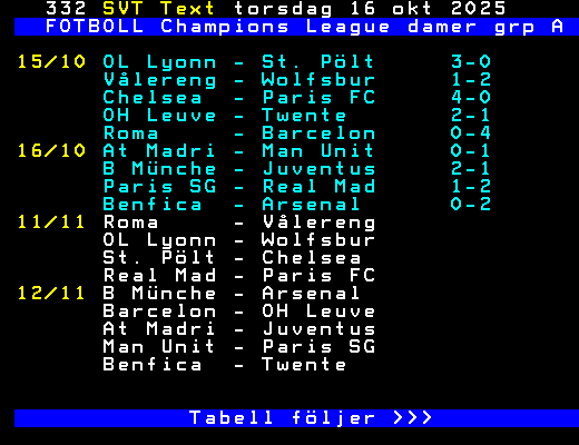 FOTBOLL Champions League damer grp A 15/10 OL Lyonn - St. Pölt 3-0 Vålereng - Wolfsbur 1-2 Chelsea - Paris FC 4-0 OH Leuve - Twente 2-1 Roma - Barcelon 0-4 16/10 At Madri - Man Unit 0-1 B Münche - Juventus 2-1 Paris SG - Real Mad 1-2 Benfica - Arsenal 0-2 11/11 Roma - Vålereng OL Lyonn - Wolfsbur St. Pölt - Chelsea Real Mad - Paris FC 12/11 B Münche - Arsenal Barcelon - OH Leuve At Madri - Juventus Man Unit - Paris SG Benfica - Twente Tabell följer >>> +Dela 2 dagar