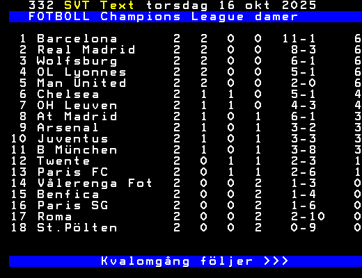 FOTBOLL Champions League damer 1 Barcelona 2 2 0 0 11-1 6 2 Real Madrid 2 2 0 0 8-3 6 3 Wolfsburg 2 2 0 0 6-1 6 4 OL Lyonnes 2 2 0 0 5-1 6 5 Man United 2 2 0 0 2-0 6 6 Chelsea 2 1 1 0 5-1 4 7 OH Leuven 2 1 1 0 4-3 4 8 At Madrid 2 1 0 1 6-1 3 9 Arsenal 2 1 0 1 3-2 3 10 Juventus 2 1 0 1 3-3 3 11 B München 2 1 0 1 3-8 3 12 Twente 2 0 1 1 2-3 1 13 Paris FC 2 0 1 1 2-6 1 14 Vålerenga Fot 2 0 0 2 1-3 0 15 Benfica 2 0 0 2 1-4 0 16 Paris SG 2 0 0 2 1-6 0 17 Roma 2 0 0 2 2-10 0 18 St.Pölten 2 0 0 2 0-9 0 Kvalomgång följer >>> +Dela 2 dagar