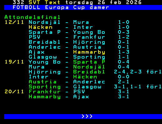 FOTBOLL Europa Cup damer Åttondelsfinal 12/11 Nordsjäl - Mura 1-0 Häcken - Inter 1-0 Sparta P - Young Bo 0-3 PSV - Frankfur 1-2 Breidabl - Hjörring 0-1 Anderlec - Austria 0-1 Ajax - Hammarby 1-3 Glasgow - Sporting 1-1 19/11 Young Bo - Sparta P 0-4 Mura - Nordsjäl 0-4 Hjörring - Breidabl 2-4,2-3 förl Inter - Häcken 0-0 Austria - Anderlec 2-1 Sporting - Glasgow 3-1,1-1 förl 20/11 Frankfur - PSV 3-1 Hammarby - Ajax 3-1 >>> +Dela 55 dagar