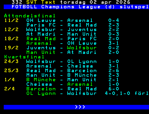 SVT Text Tors 02 Apr. 2026 FOTBOLL Champions League (d) slutspel Åttondelsfinal 11/2 OH Leuve - Arsenal 0-4 Paris FC - Real Mad 2-3 12/2 Wolfsbur - Juventus 2-2 At Madri - Man Unit 0-3 18/2 Real Mad - Paris FC 2-0 Arsenal - OH Leuve 3-1 19/2 Juventus - Wolfsbur 0-2 Man Unit - At Madri 2-0 Kvartsfinal 24/3 Wolfsbur - OL Lyonn 1-0 Arsenal - Chelsea 3-1 25/3 Real Mad - Barcelon 2-6 Man Unit - B Münche 2-3 1/4 B Münche - Man Unit 2-1 Chelsea - Arsenal 1-0 2/4 Barcelon - Real Mad 6-0 OL Lyonn - Wolfsbur 4-0,1-0 förl >>> +Dela 20 dagar
