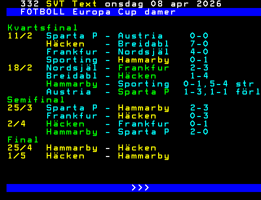 FOTBOLL Europa Cup damer Kvartsfinal 11/2 Sparta P - Austria 0-0 Häcken - Breidabl 7-0 Frankfur - Nordsjäl 4-0 Sporting - Hammarby 0-1 18/2 Nordsjäl - Frankfur 2-3 Breidabl - Häcken 1-4 Hammarby - Sporting 0-1,5-4 str Austria - Sparta P 1-3,1-1 förl Semifinal 25/3 Sparta P - Hammarby 2-3 Frankfur - Häcken 0-3 2/4 Häcken - Frankfur 0-1 Hammarby - Sparta P 2-0 Final 25/4 Hammarby - Häcken 1/5 Häcken - Hammarby >>> +Dela 14 dagar