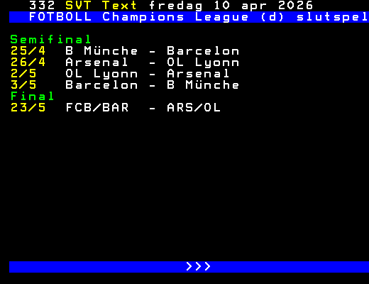 FOTBOLL Champions League (d) slutspel Semifinal 25/4 B Münche - Barcelon 26/4 Arsenal - OL Lyonn 2/5 OL Lyonn - Arsenal 3/5 Barcelon - B Münche Final 23/5 FCB/BAR - ARS/OL >>> +Dela 12 dagar