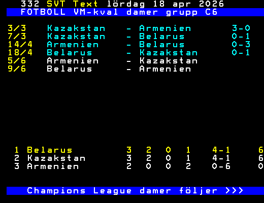 FOTBOLL VM-kval damer grupp C6 3/3 Kazakstan - Armenien 3-0 7/3 Kazakstan - Belarus 0-1 14/4 Armenien - Belarus 0-3 18/4 Belarus - Kazakstan 0-1 5/6 Armenien - Kazakstan 9/6 Belarus - Armenien 1 Belarus 3 2 0 1 4-1 6 2 Kazakstan 3 2 0 1 4-1 6 3 Armenien 2 0 0 2 0-6 0 Champions League damer följer >>> +Dela 4 dagar