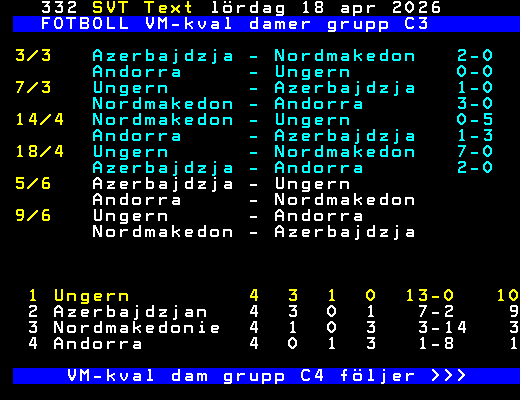 FOTBOLL VM-kval damer grupp C3 3/3 Azerbajdzja - Nordmakedon 2-0 Andorra - Ungern 0-0 7/3 Ungern - Azerbajdzja 1-0 Nordmakedon - Andorra 3-0 14/4 Nordmakedon - Ungern 0-5 Andorra - Azerbajdzja 1-3 18/4 Ungern - Nordmakedon 7-0 Azerbajdzja - Andorra 2-0 5/6 Azerbajdzja - Ungern Andorra - Nordmakedon 9/6 Ungern - Andorra Nordmakedon - Azerbajdzja 1 Ungern 4 3 1 0 13-0 10 2 Azerbajdzjan 4 3 0 1 7-2 9 3 Nordmakedonie 4 1 0 3 3-14 3 4 Andorra 4 0 1 3 1-8 1 VM-kval dam grupp C4 följer >>> +Dela 4 dagar