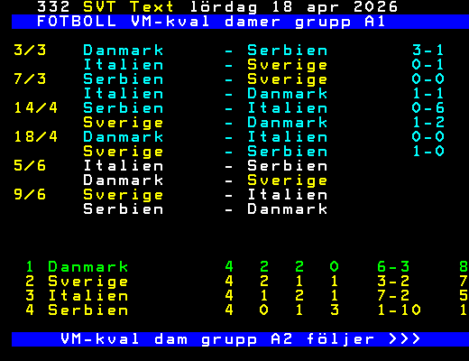 FOTBOLL VM-kval damer grupp A1 3/3 Danmark - Serbien 3-1 Italien - Sverige 0-1 7/3 Serbien - Sverige 0-0 Italien - Danmark 1-1 14/4 Serbien - Italien 0-6 Sverige - Danmark 1-2 18/4 Danmark - Italien 0-0 Sverige - Serbien 1-0 5/6 Italien - Serbien Danmark - Sverige 9/6 Sverige - Italien Serbien - Danmark 1 Danmark 4 2 2 0 6-3 8 2 Sverige 4 2 1 1 3-2 7 3 Italien 4 1 2 1 7-2 5 4 Serbien 4 0 1 3 1-10 1 VM-kval dam grupp A2 följer >>> +Dela 4 dagar