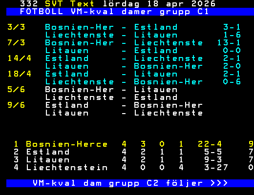FOTBOLL VM-kval damer grupp C1 3/3 Bosnien-Her - Estland 3-1 Liechtenste - Litauen 1-6 7/3 Bosnien-Her - Liechtenste 13-1 Litauen - Estland 0-0 14/4 Estland - Liechtenste 2-1 Litauen - Bosnien-Her 2-0 18/4 Estland - Litauen 2-1 Liechtenste - Bosnien-Her 0-6 5/6 Bosnien-Her - Litauen Liechtenste - Estland 9/6 Estland - Bosnien-Her Litauen - Liechtenste 1 Bosnien-Herce 4 3 0 1 22-4 9 2 Estland 4 2 1 1 5-5 7 3 Litauen 4 2 1 1 9-3 7 4 Liechtenstein 4 0 0 4 3-27 0 VM-kval dam grupp C2 följer >>> +Dela 4 dagar