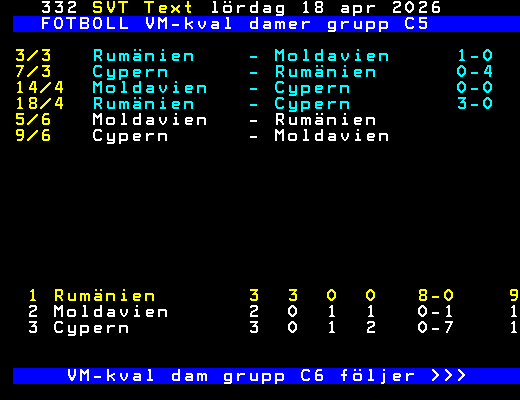 FOTBOLL VM-kval damer grupp C5 3/3 Rumänien - Moldavien 1-0 7/3 Cypern - Rumänien 0-4 14/4 Moldavien - Cypern 0-0 18/4 Rumänien - Cypern 3-0 5/6 Moldavien - Rumänien 9/6 Cypern - Moldavien 1 Rumänien 3 3 0 0 8-0 9 2 Moldavien 2 0 1 1 0-1 1 3 Cypern 3 0 1 2 0-7 1 VM-kval dam grupp C6 följer >>> +Dela 4 dagar
