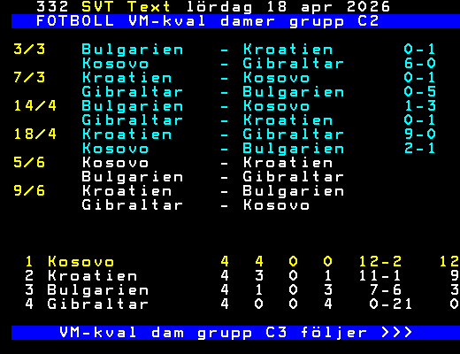 FOTBOLL VM-kval damer grupp C2 3/3 Bulgarien - Kroatien 0-1 Kosovo - Gibraltar 6-0 7/3 Kroatien - Kosovo 0-1 Gibraltar - Bulgarien 0-5 14/4 Bulgarien - Kosovo 1-3 Gibraltar - Kroatien 0-1 18/4 Kroatien - Gibraltar 9-0 Kosovo - Bulgarien 2-1 5/6 Kosovo - Kroatien Bulgarien - Gibraltar 9/6 Kroatien - Bulgarien Gibraltar - Kosovo 1 Kosovo 4 4 0 0 12-2 12 2 Kroatien 4 3 0 1 11-1 9 3 Bulgarien 4 1 0 3 7-6 3 4 Gibraltar 4 0 0 4 0-21 0 VM-kval dam grupp C3 följer >>> +Dela 4 dagar