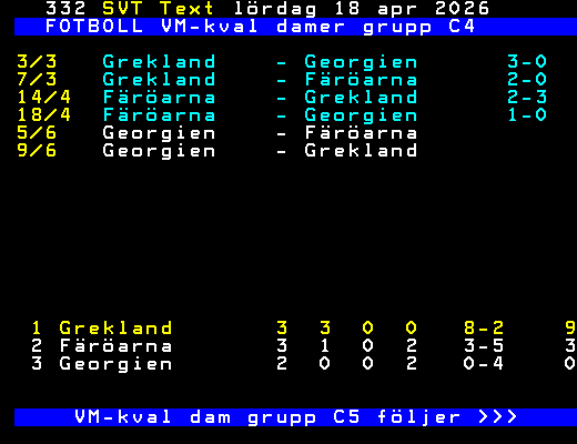 FOTBOLL VM-kval damer grupp C4 3/3 Grekland - Georgien 3-0 7/3 Grekland - Färöarna 2-0 14/4 Färöarna - Grekland 2-3 18/4 Färöarna - Georgien 1-0 5/6 Georgien - Färöarna 9/6 Georgien - Grekland 1 Grekland 3 3 0 0 8-2 9 2 Färöarna 3 1 0 2 3-5 3 3 Georgien 2 0 0 2 0-4 0 VM-kval dam grupp C5 följer >>> +Dela 4 dagar
