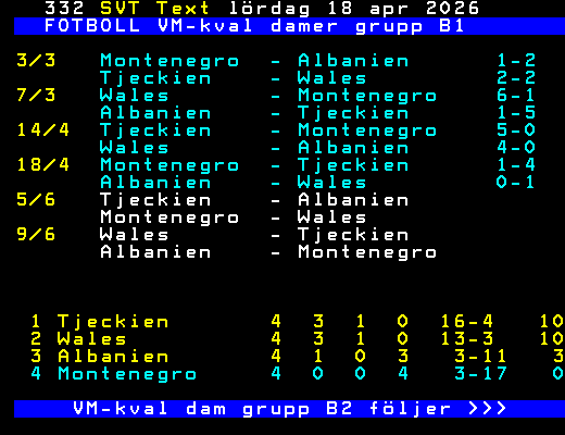 FOTBOLL VM-kval damer grupp B1 3/3 Montenegro - Albanien 1-2 Tjeckien - Wales 2-2 7/3 Wales - Montenegro 6-1 Albanien - Tjeckien 1-5 14/4 Tjeckien - Montenegro 5-0 Wales - Albanien 4-0 18/4 Montenegro - Tjeckien 1-4 Albanien - Wales 0-1 5/6 Tjeckien - Albanien Montenegro - Wales 9/6 Wales - Tjeckien Albanien - Montenegro 1 Tjeckien 4 3 1 0 16-4 10 2 Wales 4 3 1 0 13-3 10 3 Albanien 4 1 0 3 3-11 3 4 Montenegro 4 0 0 4 3-17 0 VM-kval dam grupp B2 följer >>> +Dela 4 dagar