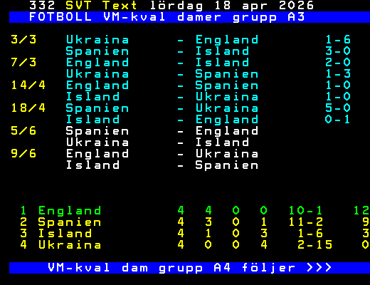 FOTBOLL VM-kval damer grupp A3 3/3 Ukraina - England 1-6 Spanien - Island 3-0 7/3 England - Island 2-0 Ukraina - Spanien 1-3 14/4 England - Spanien 1-0 Island - Ukraina 1-0 18/4 Spanien - Ukraina 5-0 Island - England 0-1 5/6 Spanien - England Ukraina - Island 9/6 England - Ukraina Island - Spanien 1 England 4 4 0 0 10-1 12 2 Spanien 4 3 0 1 11-2 9 3 Island 4 1 0 3 1-6 3 4 Ukraina 4 0 0 4 2-15 0 VM-kval dam grupp A4 följer >>> +Dela 4 dagar