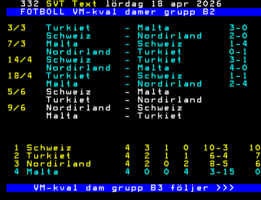 FOTBOLL VM-kval damer grupp B2 3/3 Turkiet - Malta 3-0 Schweiz - Nordirland 2-0 7/3 Malta - Schweiz 1-4 Nordirland - Turkiet 0-1 14/4 Schweiz - Turkiet 3-1 Nordirland - Malta 4-0 18/4 Turkiet - Schweiz 1-1 Malta - Nordirland 2-4 5/6 Schweiz - Malta Turkiet - Nordirland 9/6 Nordirland - Schweiz Malta - Turkiet 1 Schweiz 4 3 1 0 10-3 10 2 Turkiet 4 2 1 1 6-4 7 3 Nordirland 4 2 0 2 8-5 6 4 Malta 4 0 0 4 3-15 0 VM-kval dam grupp B3 följer >>> +Dela 4 dagar