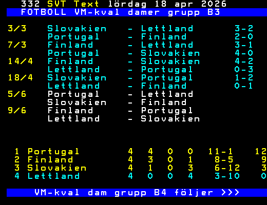FOTBOLL VM-kval damer grupp B3 3/3 Slovakien - Lettland 3-2 Portugal - Finland 2-0 7/3 Finland - Lettland 3-1 Portugal - Slovakien 4-0 14/4 Finland - Slovakien 4-2 Lettland - Portugal 0-3 18/4 Slovakien - Portugal 1-2 Lettland - Finland 0-1 5/6 Portugal - Lettland Slovakien - Finland 9/6 Finland - Portugal Lettland - Slovakien 1 Portugal 4 4 0 0 11-1 12 2 Finland 4 3 0 1 8-5 9 3 Slovakien 4 1 0 3 6-12 3 4 Lettland 4 0 0 4 3-10 0 VM-kval dam grupp B4 följer >>> +Dela 4 dagar