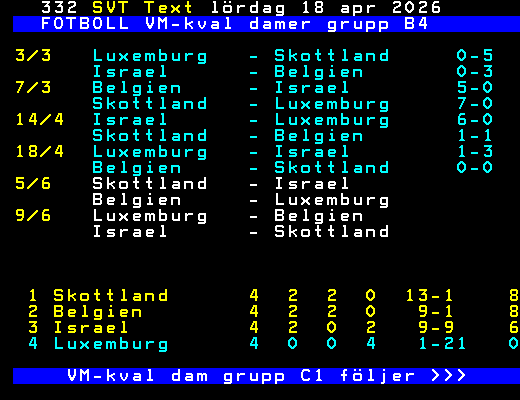 FOTBOLL VM-kval damer grupp B4 3/3 Luxemburg - Skottland 0-5 Israel - Belgien 0-3 7/3 Belgien - Israel 5-0 Skottland - Luxemburg 7-0 14/4 Israel - Luxemburg 6-0 Skottland - Belgien 1-1 18/4 Luxemburg - Israel 1-3 Belgien - Skottland 0-0 5/6 Skottland - Israel Belgien - Luxemburg 9/6 Luxemburg - Belgien Israel - Skottland 1 Skottland 4 2 2 0 13-1 8 2 Belgien 4 2 2 0 9-1 8 3 Israel 4 2 0 2 9-9 6 4 Luxemburg 4 0 0 4 1-21 0 VM-kval dam grupp C1 följer >>> +Dela 4 dagar