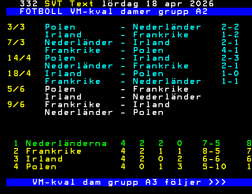 FOTBOLL VM-kval damer grupp A2 3/3 Polen - Nederländer 2-2 Irland - Frankrike 1-2 7/3 Nederländer - Irland 2-1 Frankrike - Polen 4-1 14/4 Polen - Irland 2-3 Nederländer - Frankrike 2-1 18/4 Irland - Polen 1-0 Frankrike - Nederländer 1-1 5/6 Polen - Frankrike Irland - Nederländer 9/6 Frankrike - Irland Nederländer - Polen 1 Nederländerna 4 2 2 0 7-5 8 2 Frankrike 4 2 1 1 8-5 7 3 Irland 4 2 0 2 6-6 6 4 Polen 4 0 1 3 5-10 1 VM-kval dam grupp A3 följer >>> +Dela 4 dagar