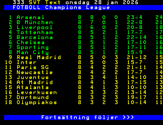 FOTBOLL Champions League 1 Arsenal 8 8 0 0 23-4 24 2 B München 8 7 0 1 22-8 21 3 Liverpool 8 6 0 2 20-8 18 4 Tottenham 8 5 2 1 17-7 17 5 Barcelona 8 5 1 2 22-14 16 6 Chelsea 8 5 1 2 17-10 16 7 Sporting 8 5 1 2 17-11 16 8 Man City 8 5 1 2 15-9 16 9 Real Madrid 8 5 0 3 21-12 15 10 Inter 8 5 0 3 15-7 15 11 Paris SG 8 4 2 2 21-11 14 12 Newcastle 8 4 2 2 17-7 14 13 Juventus 8 3 4 1 14-10 13 14 At Madrid 8 4 1 3 17-15 13 15 Atalanta 8 4 1 3 10-10 13 16 Leverkusen 8 3 3 2 13-14 12 17 Dortmund 8 3 2 3 19-17 11 18 Olympiakos 8 3 2 3 10-14 11 Fortsättning följer >>> +Dela 84 dagar