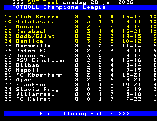 FOTBOLL Champions League 19 Club Brugge 8 3 1 4 15-17 10 20 Galatasaray 8 3 1 4 9-11 10 21 Monaco 8 2 4 2 8-14 10 22 Karabach 8 3 1 4 13-21 10 23 Bodö/Glimt 8 2 3 3 14-15 9 24 Benfica 8 3 0 5 10-12 9 25 Marseille 8 3 0 5 11-14 9 26 Pafos FC 8 2 3 3 8-11 9 27 Union SG 8 3 0 5 8-17 9 28 PSV Eindhoven 8 2 2 4 16-16 8 29 Bilbao 8 2 2 4 9-14 8 30 Napoli 8 2 2 4 9-15 8 31 FC Köpenhamn 8 2 2 4 12-21 8 32 Ajax 8 2 0 6 8-21 6 33 Frankfurt 8 1 1 6 10-21 4 34 Slavia Prag 8 0 3 5 5-19 3 35 Villarreal 8 0 1 7 5-18 1 36 FC Kairat 8 0 1 7 7-22 1 Fortsättning följer >>> +Dela 84 dagar