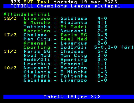 FOTBOLL Champions League slutspel Åttondelsfinal 18/3 Liverpoo - Galatasa 4-0 B Münche - Atalanta 4-1 Tottenha - At Madri 3-2 Barcelon - Newcastl 7-2 17/3 Chelsea - Paris SG 0-3 Man City - Real Mad 1-2 Arsenal - Leverkus 2-0 Sporting - Bodö/Gli 5-0,3-0 förl 11/3 Paris SG - Chelsea 5-2 Real Mad - Man City 3-0 Bodö/Gli - Sporting 3-0 Leverkus - Arsenal 1-1 10/3 Newcastl - Barcelon 1-1 Atalanta - B Münche 1-6 At Madri - Tottenha 5-2 Galatasa - Liverpoo 1-0 Tabell följer >>> +Dela 35 dagar