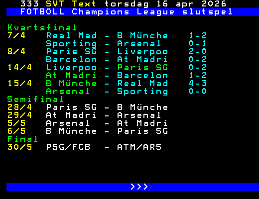 SVT Text Tors 16 Apr. 2026 FOTBOLL Champions League slutspel Kvartsfinal 7/4 Real Mad - B Münche 1-2 Sporting - Arsenal 0-1 8/4 Paris SG - Liverpoo 2-0 Barcelon - At Madri 0-2 14/4 Liverpoo - Paris SG 0-2 At Madri - Barcelon 1-2 15/4 B Münche - Real Mad 4-3 Arsenal - Sporting 0-0 Semifinal 28/4 Paris SG - B Münche 29/4 At Madri - Arsenal 5/5 Arsenal - At Madri 6/5 B Münche - Paris SG Final 30/5 PSG/FCB - ATM/ARS >>> +Dela 7 dagar