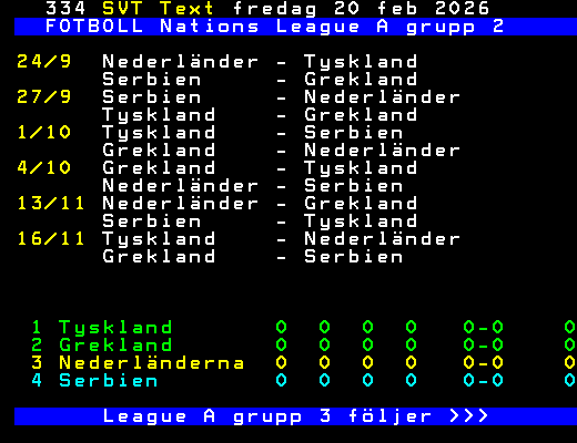 FOTBOLL Nations League A grupp 2 24/9 Nederländer - Tyskland Serbien - Grekland 27/9 Serbien - Nederländer Tyskland - Grekland 1/10 Tyskland - Serbien Grekland - Nederländer 4/10 Grekland - Tyskland Nederländer - Serbien 13/11 Nederländer - Grekland Serbien - Tyskland 16/11 Tyskland - Nederländer Grekland - Serbien 1 Tyskland 0 0 0 0 0-0 0 2 Grekland 0 0 0 0 0-0 0 3 Nederländerna 0 0 0 0 0-0 0 4 Serbien 0 0 0 0 0-0 0 League A grupp 3 följer >>> +Dela 62 dagar