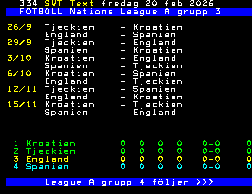FOTBOLL Nations League A grupp 3 26/9 Tjeckien - Kroatien England - Spanien 29/9 Tjeckien - England Spanien - Kroatien 3/10 Kroatien - England Spanien - Tjeckien 6/10 Kroatien - Spanien England - Tjeckien 12/11 Tjeckien - Spanien England - Kroatien 15/11 Kroatien - Tjeckien Spanien - England 1 Kroatien 0 0 0 0 0-0 0 2 Tjeckien 0 0 0 0 0-0 0 3 England 0 0 0 0 0-0 0 4 Spanien 0 0 0 0 0-0 0 League A grupp 4 följer >>> +Dela 62 dagar