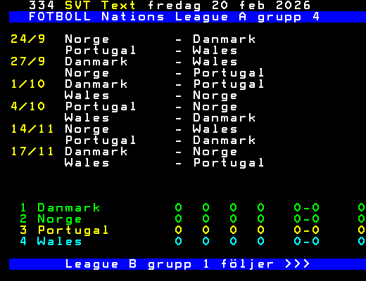 FOTBOLL Nations League A grupp 4 24/9 Norge - Danmark Portugal - Wales 27/9 Danmark - Wales Norge - Portugal 1/10 Danmark - Portugal Wales - Norge 4/10 Portugal - Norge Wales - Danmark 14/11 Norge - Wales Portugal - Danmark 17/11 Danmark - Norge Wales - Portugal 1 Danmark 0 0 0 0 0-0 0 2 Norge 0 0 0 0 0-0 0 3 Portugal 0 0 0 0 0-0 0 4 Wales 0 0 0 0 0-0 0 League B grupp 1 följer >>> +Dela 62 dagar