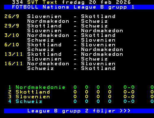 FOTBOLL Nations League B grupp 1 26/9 Slovenien - Skottland Nordmakedon - Schweiz 29/9 Skottland - Schweiz Slovenien - Nordmakedon 3/10 Nordmakedon - Skottland Schweiz - Slovenien 6/10 Skottland - Slovenien Schweiz - Nordmakedon 13/11 Skottland - Nordmakedon Slovenien - Schweiz 16/11 Nordmakedon - Slovenien Schweiz - Skottland 1 Nordmakedonie 0 0 0 0 0-0 0 2 Skottland 0 0 0 0 0-0 0 3 Slovenien 0 0 0 0 0-0 0 4 Schweiz 0 0 0 0 0-0 0 League B grupp 2 följer >>> +Dela 62 dagar