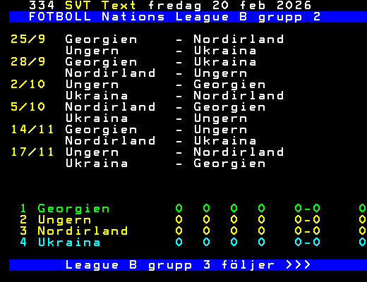 FOTBOLL Nations League B grupp 2 25/9 Georgien - Nordirland Ungern - Ukraina 28/9 Georgien - Ukraina Nordirland - Ungern 2/10 Ungern - Georgien Ukraina - Nordirland 5/10 Nordirland - Georgien Ukraina - Ungern 14/11 Georgien - Ungern Nordirland - Ukraina 17/11 Ungern - Nordirland Ukraina - Georgien 1 Georgien 0 0 0 0 0-0 0 2 Ungern 0 0 0 0 0-0 0 3 Nordirland 0 0 0 0 0-0 0 4 Ukraina 0 0 0 0 0-0 0 League B grupp 3 följer >>> +Dela 62 dagar
