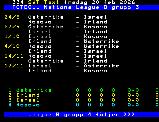 FOTBOLL Nations League B grupp 3 24/9 Österrike - Israel Kosovo - Irland 27/9 Österrike - Kosovo Israel - Irland 1/10 Israel - Kosovo Irland - Österrike 4/10 Kosovo - Österrike Irland - Israel 14/11 Kosovo - Israel Österrike - Irland 17/11 Israel - Österrike Irland - Kosovo 1 Österrike 0 0 0 0 0-0 0 2 Irland 0 0 0 0 0-0 0 3 Israel 0 0 0 0 0-0 0 4 Kosovo 0 0 0 0 0-0 0 League B grupp 4 följer >>> +Dela 62 dagar