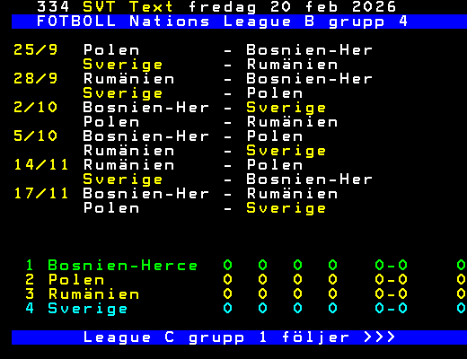 FOTBOLL Nations League B grupp 4 25/9 Polen - Bosnien-Her Sverige - Rumänien 28/9 Rumänien - Bosnien-Her Sverige - Polen 2/10 Bosnien-Her - Sverige Polen - Rumänien 5/10 Bosnien-Her - Polen Rumänien - Sverige 14/11 Rumänien - Polen Sverige - Bosnien-Her 17/11 Bosnien-Her - Rumänien Polen - Sverige 1 Bosnien-Herce 0 0 0 0 0-0 0 2 Polen 0 0 0 0 0-0 0 3 Rumänien 0 0 0 0 0-0 0 4 Sverige 0 0 0 0 0-0 0 League C grupp 1 följer >>> +Dela 62 dagar