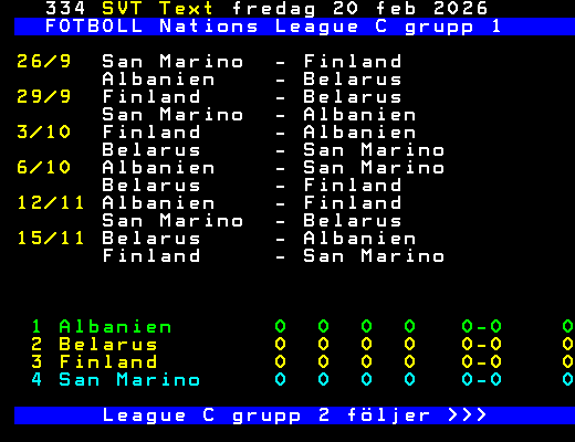 FOTBOLL Nations League C grupp 1 26/9 San Marino - Finland Albanien - Belarus 29/9 Finland - Belarus San Marino - Albanien 3/10 Finland - Albanien Belarus - San Marino 6/10 Albanien - San Marino Belarus - Finland 12/11 Albanien - Finland San Marino - Belarus 15/11 Belarus - Albanien Finland - San Marino 1 Albanien 0 0 0 0 0-0 0 2 Belarus 0 0 0 0 0-0 0 3 Finland 0 0 0 0 0-0 0 4 San Marino 0 0 0 0 0-0 0 League C grupp 2 följer >>> +Dela 62 dagar