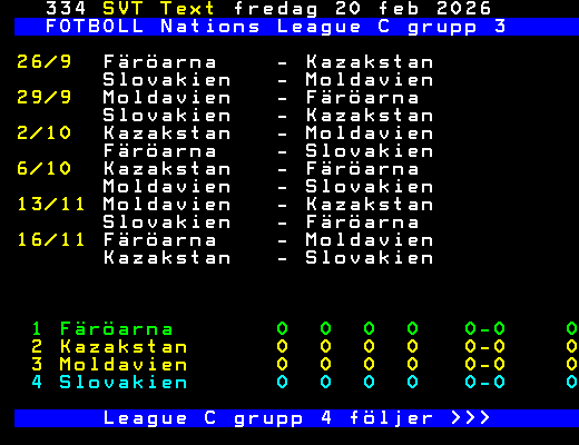 FOTBOLL Nations League C grupp 3 26/9 Färöarna - Kazakstan Slovakien - Moldavien 29/9 Moldavien - Färöarna Slovakien - Kazakstan 2/10 Kazakstan - Moldavien Färöarna - Slovakien 6/10 Kazakstan - Färöarna Moldavien - Slovakien 13/11 Moldavien - Kazakstan Slovakien - Färöarna 16/11 Färöarna - Moldavien Kazakstan - Slovakien 1 Färöarna 0 0 0 0 0-0 0 2 Kazakstan 0 0 0 0 0-0 0 3 Moldavien 0 0 0 0 0-0 0 4 Slovakien 0 0 0 0 0-0 0 League C grupp 4 följer >>> +Dela 62 dagar