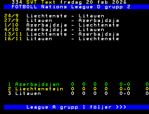 FOTBOLL Nations League D grupp 2 24/9 Liechtenste - Litauen 27/9 Litauen - Azerbajdzja 1/10 Azerbajdzja - Liechtenste 4/10 Azerbajdzja - Litauen 13/11 Liechtenste - Azerbajdzja 16/11 Litauen - Liechtenste 1 Azerbajdzjan 0 0 0 0 0-0 0 2 Liechtenstein 0 0 0 0 0-0 0 3 Litauen 0 0 0 0 0-0 0 League A grupp 1 följer >>> +Dela 62 dagar