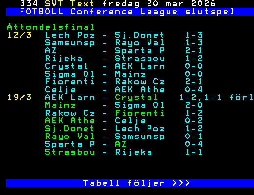 FOTBOLL Conference League slutspel Åttondelsfinal 12/3 Lech Poz - Sj.Donet 1-3 Samsunsp - Rayo Val 1-3 AZ - Sparta P 2-1 Rijeka - Strasbou 1-2 Crystal - AEK Larn 0-0 Sigma Ol - Mainz 0-0 Fiorenti - Rakow Cz 2-1 Celje - AEK Athe 0-4 19/3 AEK Larn - Crystal 1-2,1-1 förl Mainz - Sigma Ol 2-0 Rakow Cz - Fiorenti 1-2 AEK Athe - Celje 0-2 Sj.Donet - Lech Poz 1-2 Rayo Val - Samsunsp 0-1 Sparta P - AZ 0-4 Strasbou - Rijeka 1-1 Tabell följer >>> +Dela 34 dagar