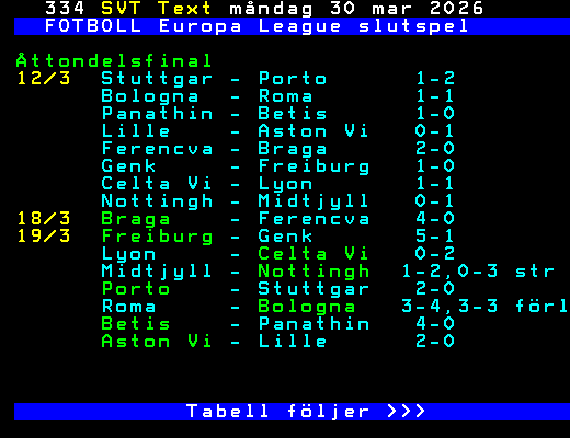 FOTBOLL Europa League slutspel Åttondelsfinal 12/3 Stuttgar - Porto 1-2 Bologna - Roma 1-1 Panathin - Betis 1-0 Lille - Aston Vi 0-1 Ferencva - Braga 2-0 Genk - Freiburg 1-0 Celta Vi - Lyon 1-1 Nottingh - Midtjyll 0-1 18/3 Braga - Ferencva 4-0 19/3 Freiburg - Genk 5-1 Lyon - Celta Vi 0-2 Midtjyll - Nottingh 1-2,0-3 str Porto - Stuttgar 2-0 Roma - Bologna 3-4,3-3 förl Betis - Panathin 4-0 Aston Vi - Lille 2-0 Tabell följer >>> +Dela 24 dagar