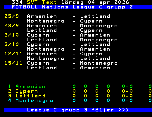 FOTBOLL Nations League C grupp 2 25/9 Armenien - Lettland Montenegro - Cypern 28/9 Armenien - Montenegro Lettland - Cypern 2/10 Cypern - Armenien Lettland - Montenegro 5/10 Cypern - Lettland Montenegro - Armenien 12/11 Armenien - Cypern Montenegro - Lettland 15/11 Cypern - Montenegro Lettland - Armenien 1 Armenien 0 0 0 0 0-0 0 2 Cypern 0 0 0 0 0-0 0 3 Lettland 0 0 0 0 0-0 0 4 Montenegro 0 0 0 0 0-0 0 League C grupp 3 följer >>> +Dela 19 dagar