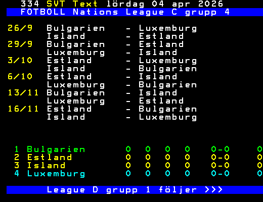 FOTBOLL Nations League C grupp 4 26/9 Bulgarien - Luxemburg Island - Estland 29/9 Bulgarien - Estland Luxemburg - Island 3/10 Estland - Luxemburg Island - Bulgarien 6/10 Estland - Island Luxemburg - Bulgarien 13/11 Bulgarien - Island Luxemburg - Estland 16/11 Estland - Bulgarien Island - Luxemburg 1 Bulgarien 0 0 0 0 0-0 0 2 Estland 0 0 0 0 0-0 0 3 Island 0 0 0 0 0-0 0 4 Luxemburg 0 0 0 0 0-0 0 League D grupp 1 följer >>> +Dela 19 dagar