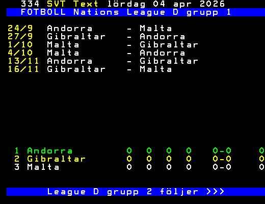 FOTBOLL Nations League D grupp 1 24/9 Andorra - Malta 27/9 Gibraltar - Andorra 1/10 Malta - Gibraltar 4/10 Malta - Andorra 13/11 Andorra - Gibraltar 16/11 Gibraltar - Malta 1 Andorra 0 0 0 0 0-0 0 2 Gibraltar 0 0 0 0 0-0 0 3 Malta 0 0 0 0 0-0 0 League D grupp 2 följer >>> +Dela 19 dagar