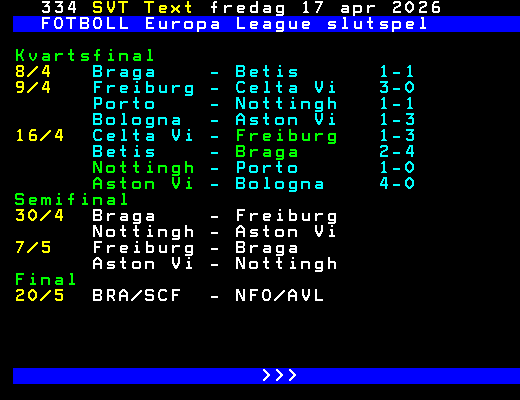 SVT Text Fre 17 Apr. 2026 FOTBOLL Europa League slutspel Kvartsfinal 8/4 Braga - Betis 1-1 9/4 Freiburg - Celta Vi 3-0 Porto - Nottingh 1-1 Bologna - Aston Vi 1-3 16/4 Celta Vi - Freiburg 1-3 Betis - Braga 2-4 Nottingh - Porto 1-0 Aston Vi - Bologna 4-0 Semifinal 30/4 Braga - Freiburg Nottingh - Aston Vi 7/5 Freiburg - Braga Aston Vi - Nottingh Final 20/5 BRA/SCF - NFO/AVL >>> +Dela 6 dagar