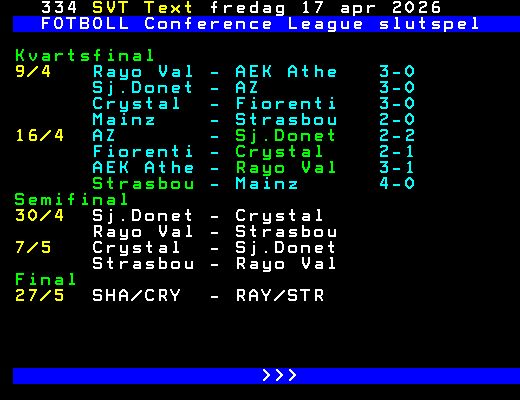 FOTBOLL Conference League slutspel Kvartsfinal 9/4 Rayo Val - AEK Athe 3-0 Sj.Donet - AZ 3-0 Crystal - Fiorenti 3-0 Mainz - Strasbou 2-0 16/4 AZ - Sj.Donet 2-2 Fiorenti - Crystal 2-1 AEK Athe - Rayo Val 3-1 Strasbou - Mainz 4-0 Semifinal 30/4 Sj.Donet - Crystal Rayo Val - Strasbou 7/5 Crystal - Sj.Donet Strasbou - Rayo Val Final 27/5 SHA/CRY - RAY/STR >>> +Dela 6 dagar