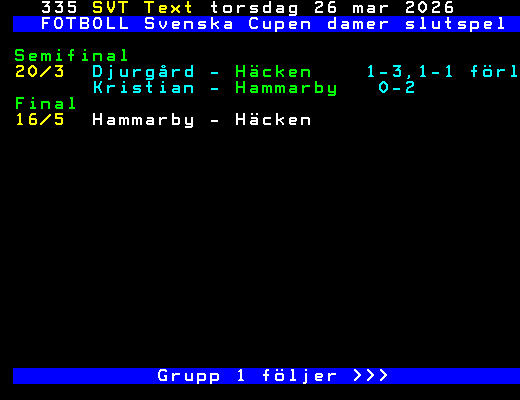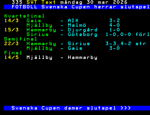 SVT Text Mån 30 Mars 2026 FOTBOLL Svenska Cupen herrar slutspel Kvartsfinal 14/3 Gais - AIK 3-2 Mjällby - Malmö 4-0 15/3 Hammarby - Djurgård 1-0 Sirius - Göteborg 1-0,0-0 förl Semifinal 22/3 Hammarby - Sirius 3-3,4-2 str Mjällby - Gais 3-0 Final 14/5 Mjällby - Hammarby Svenska Cupen damer slutspel >>> +Dela 24 dagar