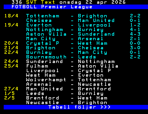 SVT Text Ons 22 Apr. 2026 FOTBOLL Premier League 18/4 Tottenham - Brighton 2-2 Chelsea - Man United 0-1 19/4 Everton - Liverpool 1-2 Nottingham - Burnley 4-1 Aston Villa - Sunderland 4-3 Man City - Arsenal 2-1 20/4 Crystal P - West Ham 0-0 21/4 Brighton - Chelsea 3-0 22/4 Burnley - Man City 0-1 Bournemouth - Leeds 2-2 24/4 Sunderland - Nottingham 25/4 Fulham - Aston Villa Liverpool - Crystal P West Ham - Everton Wolverhampt - Tottenham Arsenal - Newcastle 27/4 Man United - Brentford 1/5 Leeds - Burnley 2/5 Brentford - West Ham Newcastle - Brighton Tabell följer >>> +Dela Igår 23:05