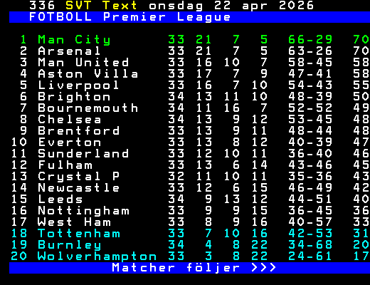 FOTBOLL Premier League 1 Man City 33 21 7 5 66-29 70 2 Arsenal 33 21 7 5 63-26 70 3 Man United 33 16 10 7 58-45 58 4 Aston Villa 33 17 7 9 47-41 58 5 Liverpool 33 16 7 10 54-43 55 6 Brighton 34 13 11 10 48-39 50 7 Bournemouth 34 11 16 7 52-52 49 8 Chelsea 34 13 9 12 53-45 48 9 Brentford 33 13 9 11 48-44 48 10 Everton 33 13 8 12 40-39 47 11 Sunderland 33 12 10 11 36-40 46 12 Fulham 33 13 6 14 43-46 45 13 Crystal P 32 11 10 11 35-36 43 14 Newcastle 33 12 6 15 46-49 42 15 Leeds 34 9 13 12 44-51 40 16 Nottingham 33 9 9 15 36-45 36 17 West Ham 33 8 9 16 40-57 33 18 Tottenham 33 7 10 16 42-53 31 19 Burnley 34 4 8 22 34-68 20 20 Wolverhampton 33 3 8 22 24-61 17 Matcher följer >>> +Dela Igår 23:05