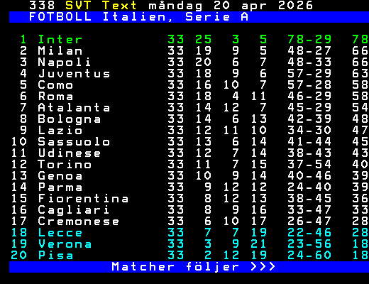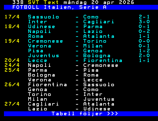 SVT Text Mån 20 Apr. 2026 FOTBOLL Italien, Serie A 17/4 Sassuolo - Como 2-1 Inter - Cagliari 3-0 18/4 Udinese - Parma 0-1 Napoli - Lazio 0-2 Roma - Atalanta 1-1 19/4 Cremonese - Torino 0-0 Verona - Milan 0-1 Pisa - Genoa 1-2 Juventus - Bologna 2-0 20/4 Lecce - Fiorentina 1-1 24/4 Napoli - Cremonese 25/4 Parma - Pisa Bologna - Roma Verona - Lecce 26/4 Fiorentina - Sassuolo Genoa - Como Torino - Inter Milan - Juventus 27/4 Cagliari - Atalanta Lazio - Udinese Tabell följer >>> +Dela 2 dagar