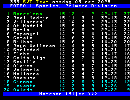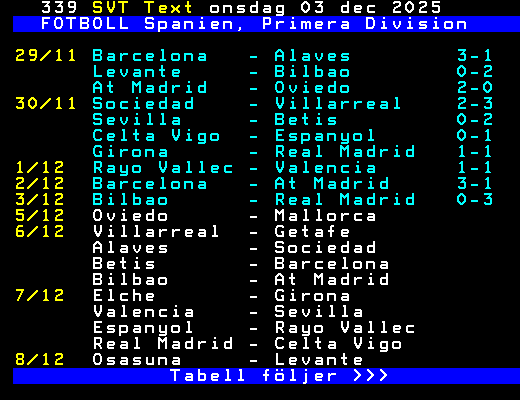 SVT Text Ons 03 Dec. 2025 FOTBOLL Spanien, Primera Division 29/11 Barcelona - Alaves 3-1 Levante - Bilbao 0-2 At Madrid - Oviedo 2-0 30/11 Sociedad - Villarreal 2-3 Sevilla - Betis 0-2 Celta Vigo - Espanyol 0-1 Girona - Real Madrid 1-1 1/12 Rayo Vallec - Valencia 1-1 2/12 Barcelona - At Madrid 3-1 3/12 Bilbao - Real Madrid 0-3 5/12 Oviedo - Mallorca 6/12 Villarreal - Getafe Alaves - Sociedad Betis - Barcelona Bilbao - At Madrid 7/12 Elche - Girona Valencia - Sevilla Espanyol - Rayo Vallec Real Madrid - Celta Vigo 8/12 Osasuna - Levante Tabell följer >>> +Dela Igår 20:55