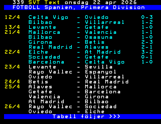 SVT Text Ons 22 Apr. 2026 FOTBOLL Spanien, Primera Division 12/4 Celta Vigo - Oviedo 0-3 Bilbao - Villarreal 1-2 13/4 Levante - Getafe 1-0 21/4 Mallorca - Valencia 1-1 Bilbao - Osasuna 1-0 Girona - Betis 2-3 Real Madrid - Alaves 2-1 22/4 Elche - At Madrid 3-2 Sociedad - Getafe 0-1 Barcelona - Celta Vigo 1-0 23/4 Levante - Sevilla Rayo Vallec - Espanyol Oviedo - Villarreal 24/4 Betis - Real Madrid 25/4 Alaves - Mallorca Getafe - Barcelona Valencia - Girona At Madrid - Bilbao 26/4 Rayo Vallec - Sociedad Oviedo - Elche Tabell följer >>> +Dela Igår 23:55