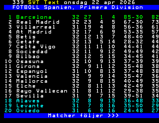 FOTBOLL Spanien, Primera Division 1 Barcelona 32 27 1 4 85-30 82 2 Real Madrid 32 23 4 5 67-30 73 3 Villarreal 31 19 4 8 56-36 61 4 At Madrid 32 17 6 9 53-35 57 5 Betis 32 12 13 7 48-40 49 6 Getafe 32 13 5 14 28-32 44 7 Celta Vigo 32 11 11 10 44-41 44 8 Sociedad 32 11 9 12 49-49 42 9 Bilbao 32 12 5 15 34-45 41 10 Osasuna 32 10 9 13 37-39 39 11 Girona 32 9 11 12 35-48 38 12 Espanyol 31 10 8 13 37-48 38 13 Valencia 32 9 9 14 35-47 36 14 Mallorca 32 9 8 15 40-49 35 15 Elche 32 8 11 13 42-49 35 16 Rayo Vallecan 31 8 11 12 29-38 35 17 Sevilla 31 9 7 15 39-51 34 18 Alaves 32 8 9 15 36-48 33 19 Levante 31 7 8 16 35-50 29 20 Oviedo 31 6 9 16 24-48 27 Matcher följer >>> +Dela Igår 23:55