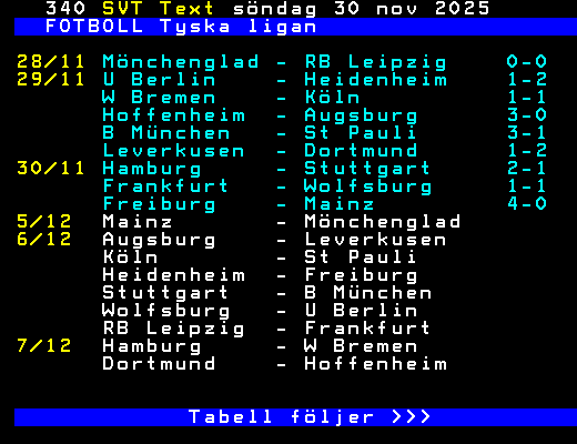 FOTBOLL Tyska ligan 28/11 Mönchenglad - RB Leipzig 0-0 29/11 U Berlin - Heidenheim 1-2 W Bremen - Köln 1-1 Hoffenheim - Augsburg 3-0 B München - St Pauli 3-1 Leverkusen - Dortmund 1-2 30/11 Hamburg - Stuttgart 2-1 Frankfurt - Wolfsburg 1-1 Freiburg - Mainz 4-0 5/12 Mainz - Mönchenglad 6/12 Augsburg - Leverkusen Köln - St Pauli Heidenheim - Freiburg Stuttgart - B München Wolfsburg - U Berlin RB Leipzig - Frankfurt 7/12 Hamburg - W Bremen Dortmund - Hoffenheim Tabell följer >>> +Dela 3 dagar