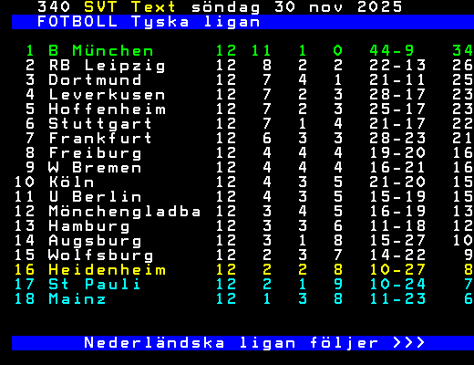 FOTBOLL Tyska ligan 1 B München 12 11 1 0 44-9 34 2 RB Leipzig 12 8 2 2 22-13 26 3 Dortmund 12 7 4 1 21-11 25 4 Leverkusen 12 7 2 3 28-17 23 5 Hoffenheim 12 7 2 3 25-17 23 6 Stuttgart 12 7 1 4 21-17 22 7 Frankfurt 12 6 3 3 28-23 21 8 Freiburg 12 4 4 4 19-20 16 9 W Bremen 12 4 4 4 16-21 16 10 Köln 12 4 3 5 21-20 15 11 U Berlin 12 4 3 5 15-19 15 12 Mönchengladba 12 3 4 5 16-19 13 13 Hamburg 12 3 3 6 11-18 12 14 Augsburg 12 3 1 8 15-27 10 15 Wolfsburg 12 2 3 7 14-22 9 16 Heidenheim 12 2 2 8 10-27 8 17 St Pauli 12 2 1 9 10-24 7 18 Mainz 12 1 3 8 11-23 6 Nederländska ligan följer >>> +Dela 3 dagar