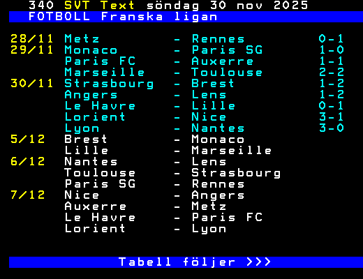 SVT Text Sön 30 Nov. 2025 FOTBOLL Franska ligan 28/11 Metz - Rennes 0-1 29/11 Monaco - Paris SG 1-0 Paris FC - Auxerre 1-1 Marseille - Toulouse 2-2 30/11 Strasbourg - Brest 1-2 Angers - Lens 1-2 Le Havre - Lille 0-1 Lorient - Nice 3-1 Lyon - Nantes 3-0 5/12 Brest - Monaco Lille - Marseille 6/12 Nantes - Lens Toulouse - Strasbourg Paris SG - Rennes 7/12 Nice - Angers Auxerre - Metz Le Havre - Paris FC Lorient - Lyon Tabell följer >>> +Dela 3 dagar